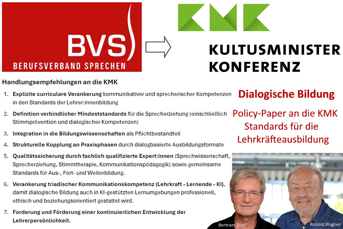 Wir freuen uns, dass dieses Policy-Paper offiziell (mit Schreiben vom 19.02.2026) in den Arbeitsprozess der KMK aufgenommen wurde. Die KMK entwickelt in diesem Jahr neue Standards für die Lehrkräftebildung. Unsere Eingabe betrifft den künftigen triadischen Lernraum (Lernende im Gespräch - durch KI inspiriert), in dem dialogische Kommunikation eine Schlüsselrolle spielen wird.